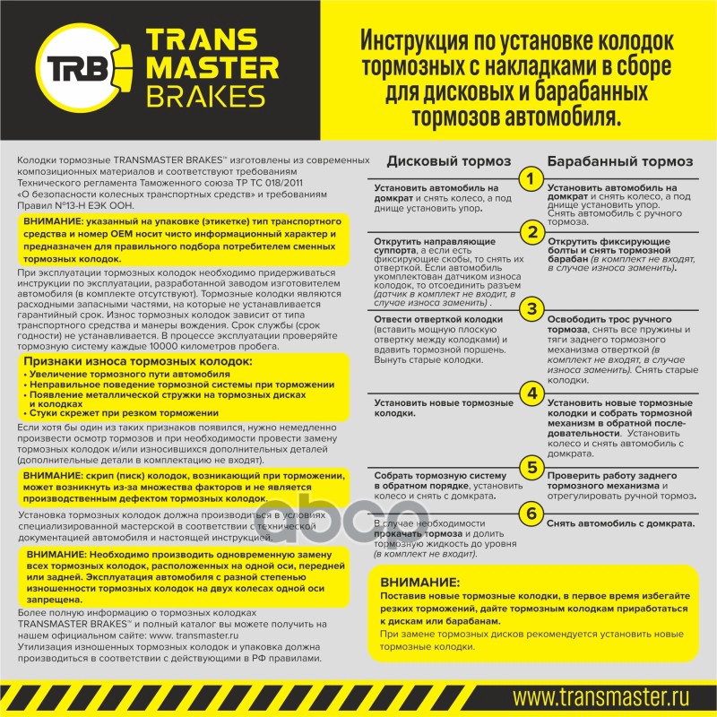 Бренд: TRANSMASTER, артикул: TH110, Колодки стояночного барабанного тормоза. |