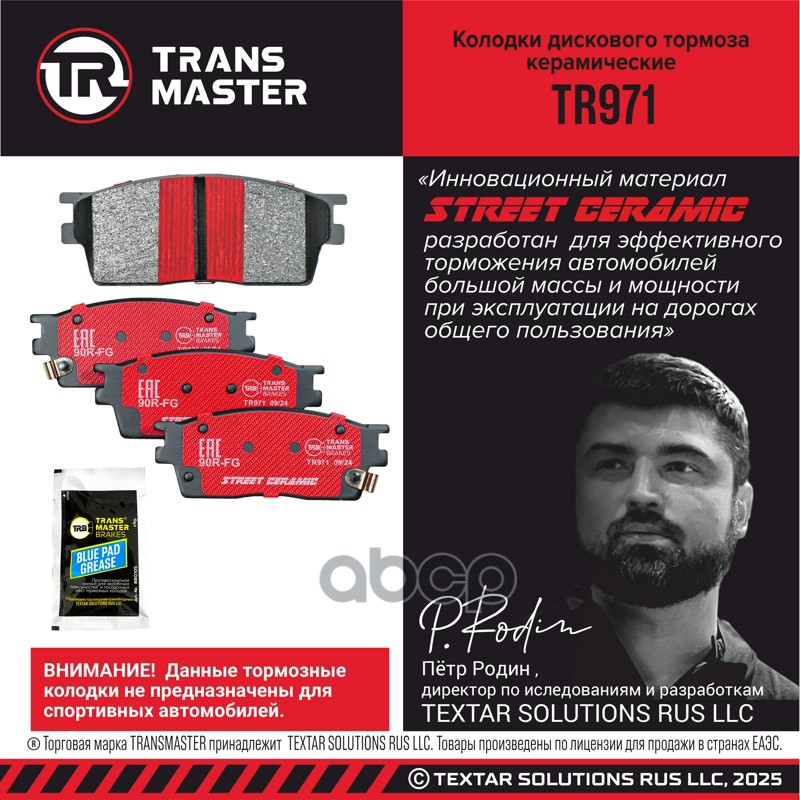 Бренд: TRANSMASTER, артикул: TR971, Колодки дискового тормоза керамические. |