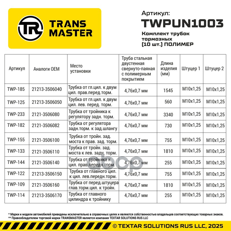 Бренд: TRANSMASTER, артикул: TWPUN1003, Трубки тормозные ВАЗ 21213 (двустенная свернуто-паяная трубка с полимерным покрытием OEM качество). |