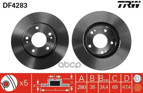 Торм.диск пер.вент.[280x26] 5 отв. HYUNDAI Tucson 2.0/D/4x4/2.7 08/04->, KIA Sportage 2.0/D/4WD/2.7 09/04->