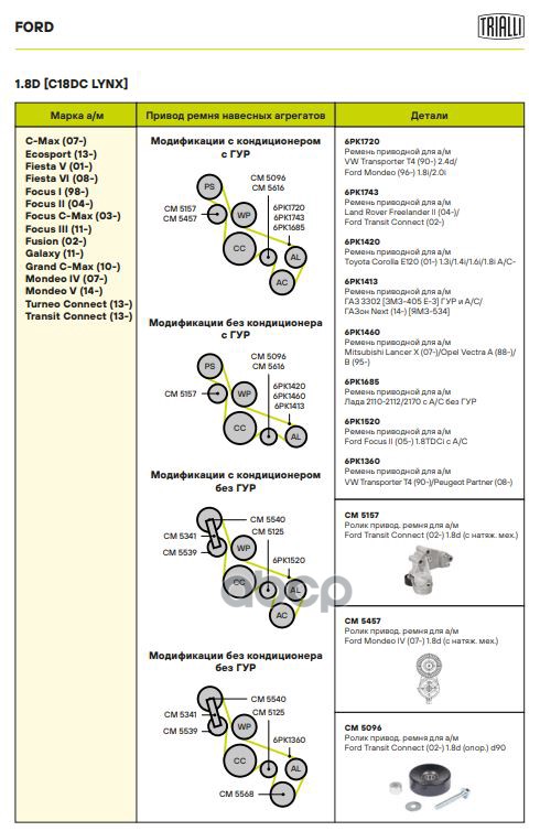 Бренд: Trialli, артикул: CM5157, Ролик приводного ремня Ford Transit Connect (02-) 1.8d (с натяж. мех.) Trialli CM 5157 1069359;1073485;1079155;1113611;1473384;1S4Q6A228AE;654270;RT1037;0380471;160026210;A05424;TOA3667;E2G5260BTA;0188;10968;V85582;APV2710;P216001;14866;28094;FS99478;T384. |
