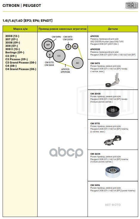 Наименование: Ролик приводного ремня Peugeot 308 07- 1.4i/1.6i (EP) помпы с натяж. мех. Trialli CM 5772 120455;11287534400;11287571013;11287598831;11287598832;T36836;T38770;APV3627;102601;534042510;PT3341;MS1712;AG00316;SR1762;