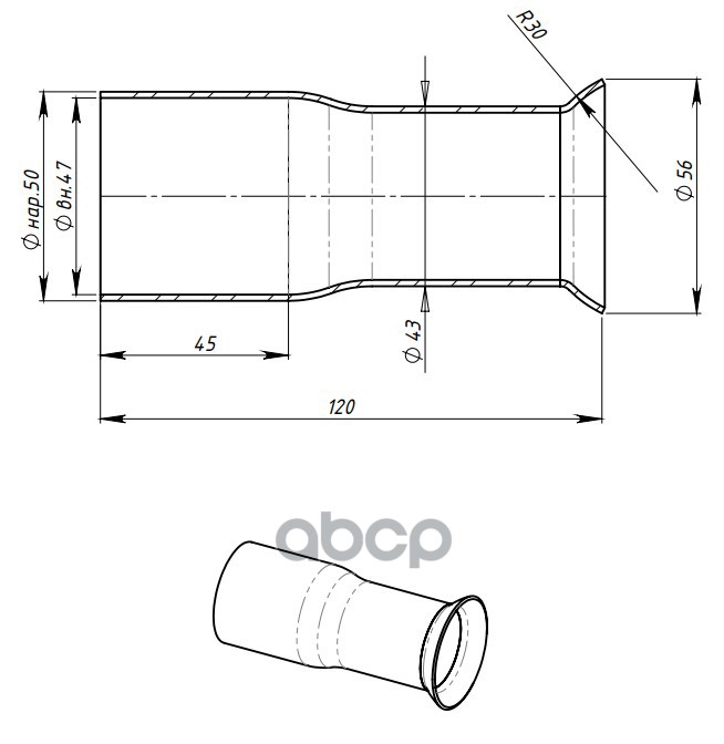 Наименование: соединитель труб глушителя - переходник d50мм/R30/d56мм L120 универс.