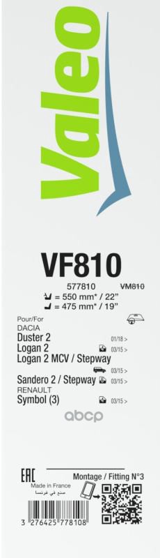 Бренд: Valeo, артикул: 577810, Щетки стеклоочистителя 550мм/475мм (комплект).
