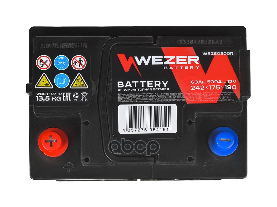 Бренд: WEZER, артикул: WEZ60500R, аккумуляторная батарея 60Ah 500A +справа 242/175/190.