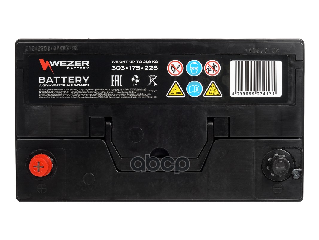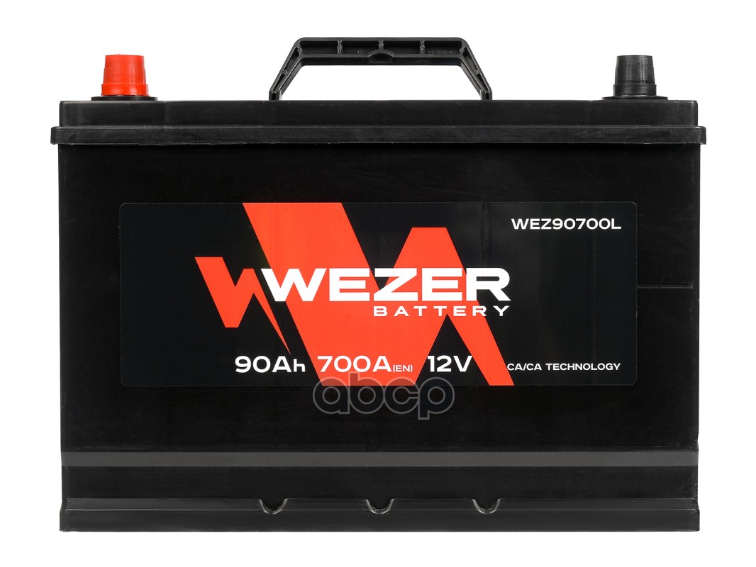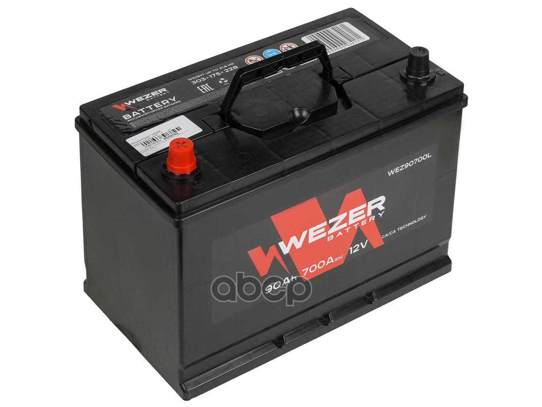 Бренд: WEZER, артикул: WEZ90700L, аккумуляторная батарея 90Ah 700A JIS +слева 303/175/228.