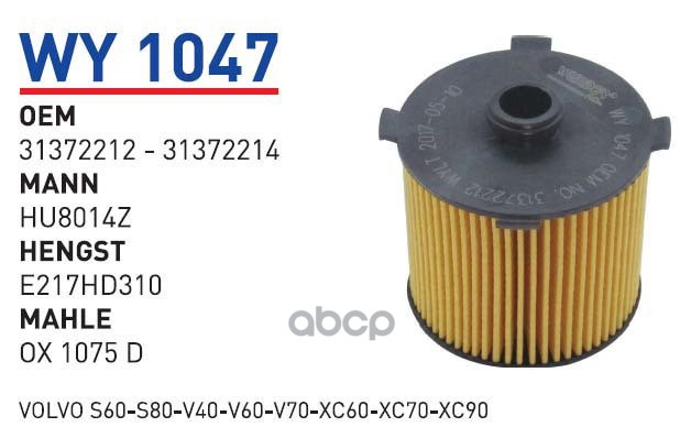 WY1047 Производитель: WUNDER FILTER WY1047 Фильтр масляный VOLVO S60, S80, V40, V60, V70, XC60, XC