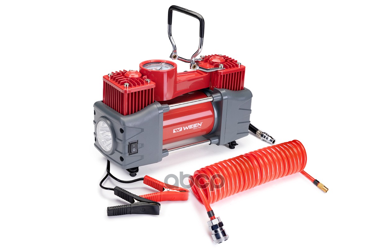 Бренд: Ween, артикул: 1721004, Компрессор (240 W, 50L/MIN, 12 V, 10 атм./150 PSI) Двухпоршневой, подключение к акб., LED фонарь, витой шланг 5м., комплект переходников, предохранитель, сумка. |