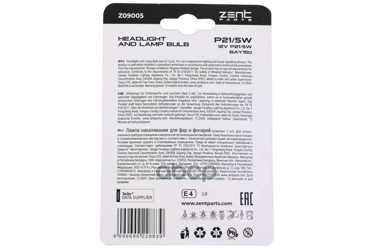 Купить запчасть Z09005 к-кт ламп накаливания P21/5W 12V 21/5W BAY15d (блистер 2шт.) с доставкой по России.