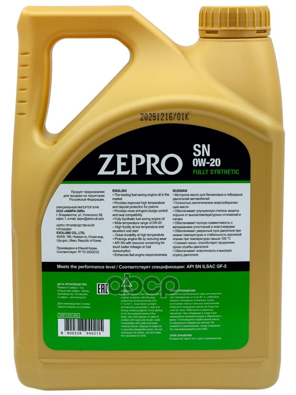 Наименование: Масло моторное 0W-20 ZEPRO F-S SN/GF-5 (4л.) Масло моторное 0W-20 ZEPRO F-S SN/GF-5 (4л.)