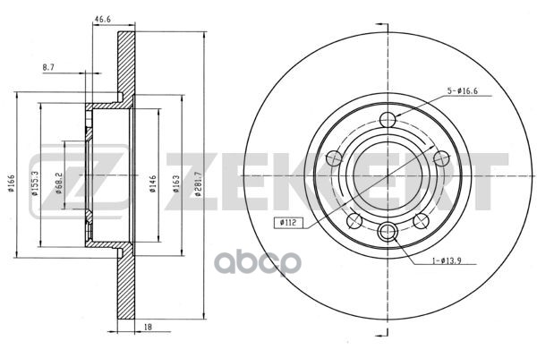 Наименование: Диск тормозной VW Transporter IV 90- передний 282 х 18 Zekkert BS-5093 701615301G